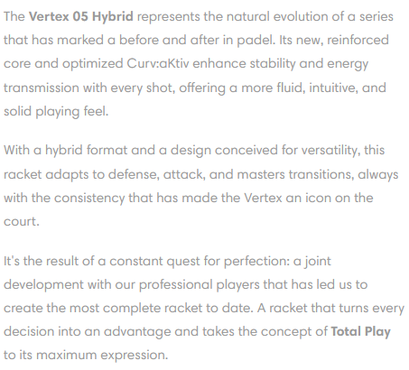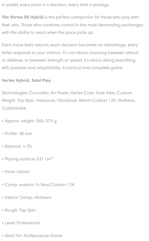De Bullpadel Vertex 05 Hybrid is de ultieme keuze voor de veeleisende padeller die op zoek is naar een perfecte symbiose tussen dodelijke kracht en chirurgische controle. Dankzij de innovatieve hybride vorm en de Curvaktiv-technologie biedt dit racket een verbeterde torsiestijfheid, waardoor je zelfs bij de meest intense slagen maximale stabiliteit ervaart. Het blad, vervaardigd uit hoogwaardig Xtend Carbon 12K en voorzien van een MultiEva-kern, reageert intuïtief op jouw spel: explosief bij aanvallende smashes en uiterst gedempt bij subtiele verdedigende ballen. Met de toevoeging van het Air Power-systeem voor superieure aerodynamica en de kenmerkende Topspin-textuur voor ongekende grip op de bal, is de Vertex 05 Hybrid in zijn stijlvolle zwart-blauwe design hèt instrument om het tempo op de baan volledig te dicteren.