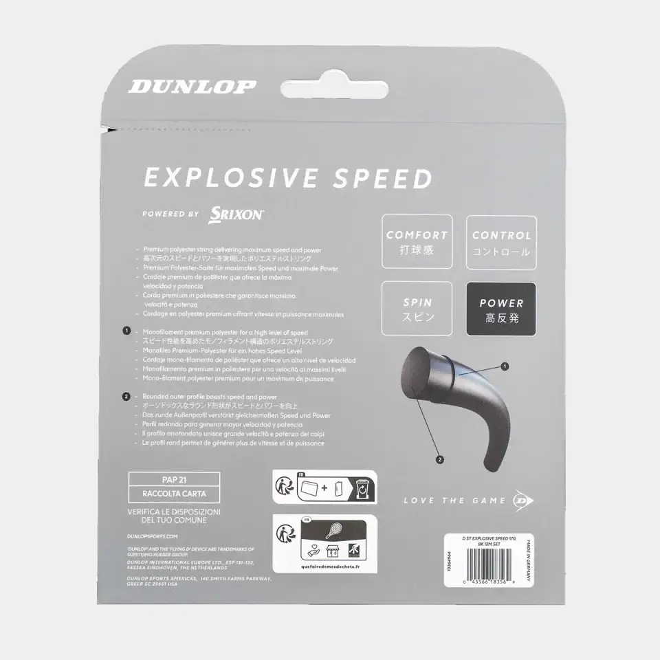 De Dunlop Explosive Speed 17G 12 Meter Set is een hoogwaardige polyester tennissnaar die ontwikkeld is voor spelers die maximale snelheid en krachtige slagen willen genereren. De snaar is gemaakt van premium monofilament polyester, wat zorgt voor een direct en responsief gevoel bij balcontact. Dankzij het ronde buitenprofiel kan de snaar soepel door het snaarbed bewegen, wat extra power en een snelle balafgifte oplevert. Met een dikte van 17 gauge (1,25 mm) biedt deze snaar een goede combinatie van spinpotentieel, controle en speelgevoel. De 12 meter set bevat voldoende snaar om één tennisracket volledig te bespannen en is ideaal voor spelers die op zoek zijn naar een snelle, moderne polyestersnaar met krachtige prestaties.