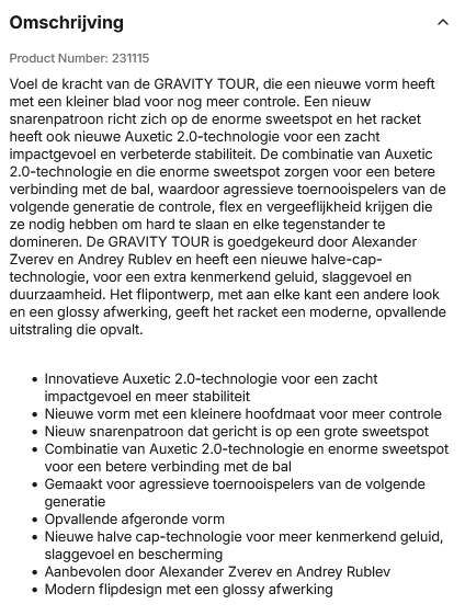 De Gravity Tour heeft een kenmerkende druppelvormige bladkop die bovenin breder is. Hierdoor ligt de sweetspot hoger op het blad, precies waar moderne spelers de bal het vaakst raken. Dit resulteert in meer vergevingsgezindheid en power, zelfs bij ballen die je niet perfect in het midden raakt.