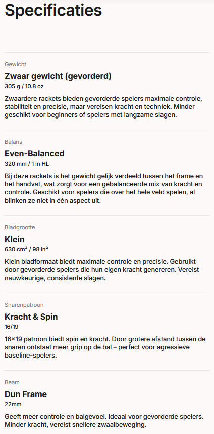 Gevorderde spelers & Wedstrijdspelers: Met een onbespannen gewicht van 305 gram vereist dit racket een goede techniek en eigen kracht om het maximale eruit te halen.