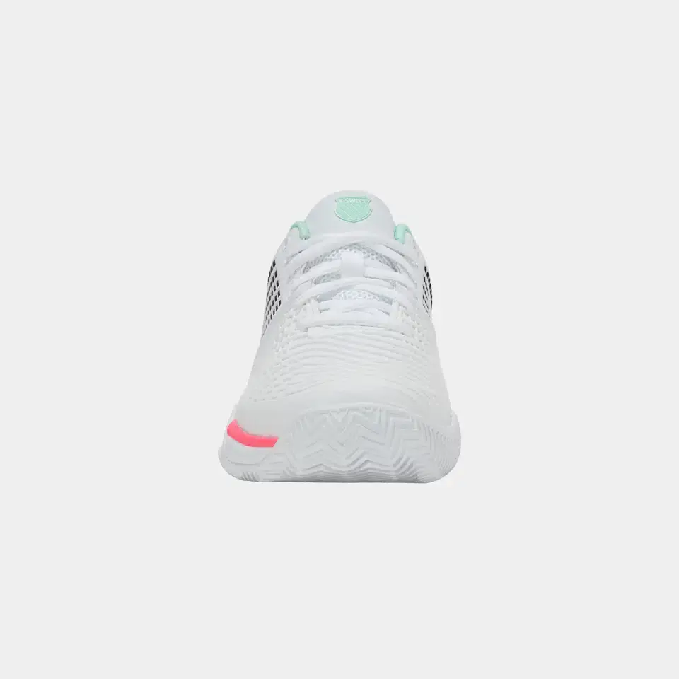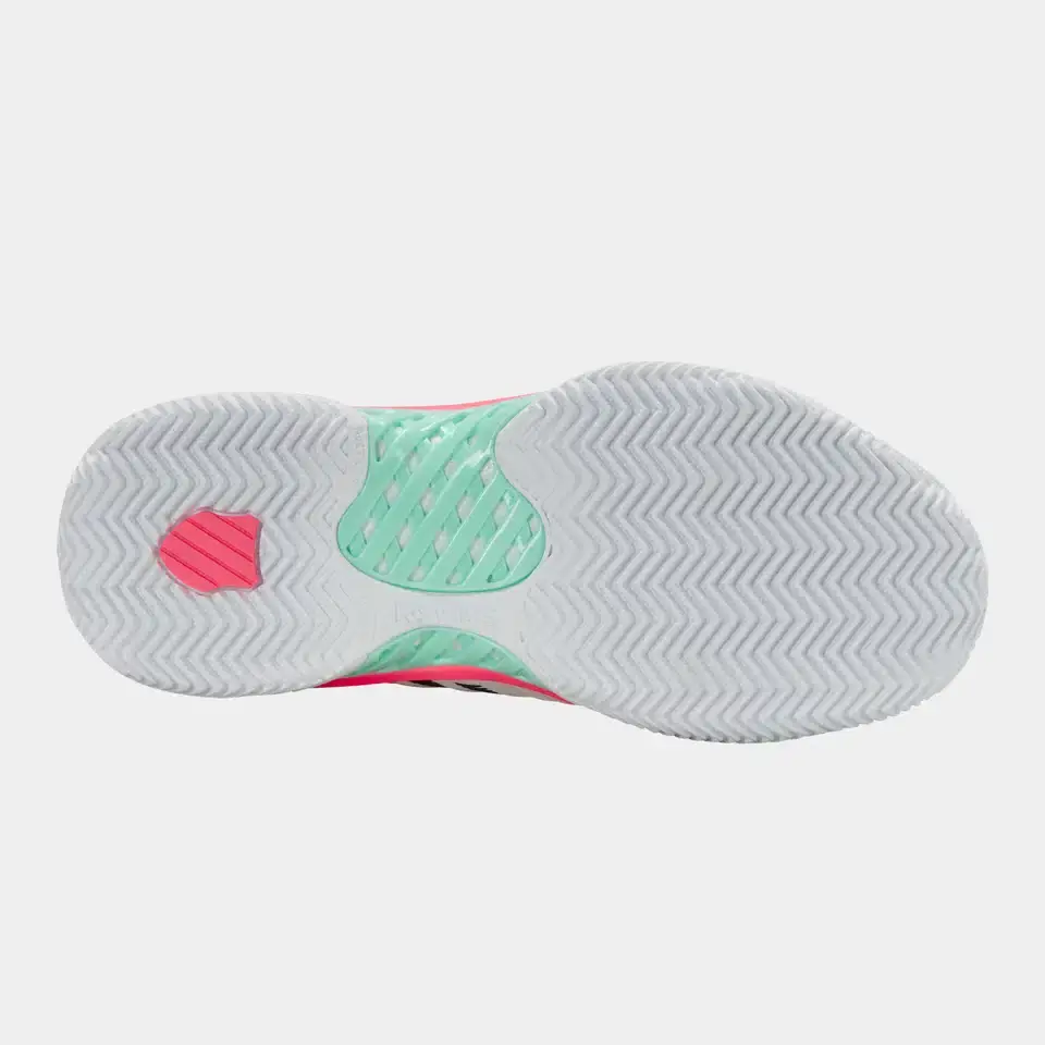 De K-SWISS EXPRESS LIGHT 3 CLAY – WIT/MINT/ROZE is een lichtgewicht en comfortabele tennisschoen ontworpen voor gravel- en smashcourt-banen (en ook geschikt voor kunstgras/padel), uitgevoerd in een stijlvol zwart/mint/roze-design; hij heeft een bovenwerk van synthetische materialen met ademende mesh en DuraWrap Flex-ondersteuning, een zachte, goed gevoerde kraag rond de enkels voor stabiliteit, en een rubberen Aösta-zool met diep visgraatprofiel voor uitstekende grip en duurzaamheid tijdens intensieve bewegingen op de baan, terwijl de demping en pasvorm zorgen voor comfort gedurende lange wedstrijden.