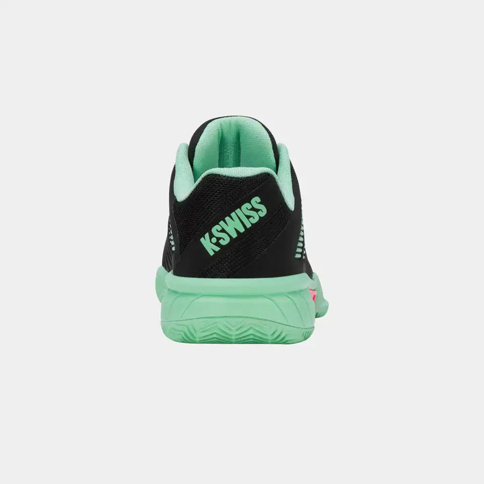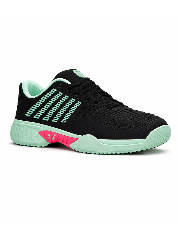De K-SWISS EXPRESS LIGHT 3 CLAY – ZWART/MINT/ROZE is een lichtgewicht en comfortabele tennisschoen ontworpen voor gravel- en smashcourt-banen (en ook geschikt voor kunstgras/padel), uitgevoerd in een stijlvol zwart/mint/roze-design; hij heeft een bovenwerk van synthetische materialen met ademende mesh en DuraWrap Flex-ondersteuning, een zachte, goed gevoerde kraag rond de enkels voor stabiliteit, en een rubberen Aösta-zool met diep visgraatprofiel voor uitstekende grip en duurzaamheid tijdens intensieve bewegingen op de baan, terwijl de demping en pasvorm zorgen voor comfort gedurende lange wedstrijden.