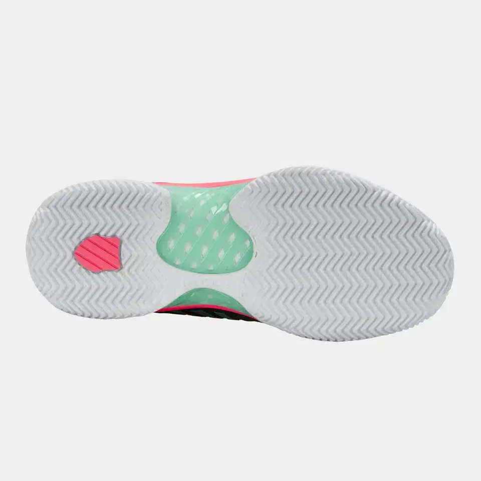 De K-SWISS HYPERCOURT EXPRESS 2 CLAY – ZWART/WIT/MINT is een lichtgewicht en comfortabele tennisschoen ontworpen voor gravel- en smashcourt-banen, met een stijlvol zwart/wit/mint-design; hij combineert een ademend bovenwerk van synthetisch materiaal en mesh met duurzame technologieën zoals Durawrap Flex en een Surgelite-tussenzool voor uitstekende demping, stabiliteit en ondersteuning tijdens intensieve rally’s, terwijl het visgraat-profiel op de rubberen buitenzool maximale grip biedt op kleibanen en kunstgras.
