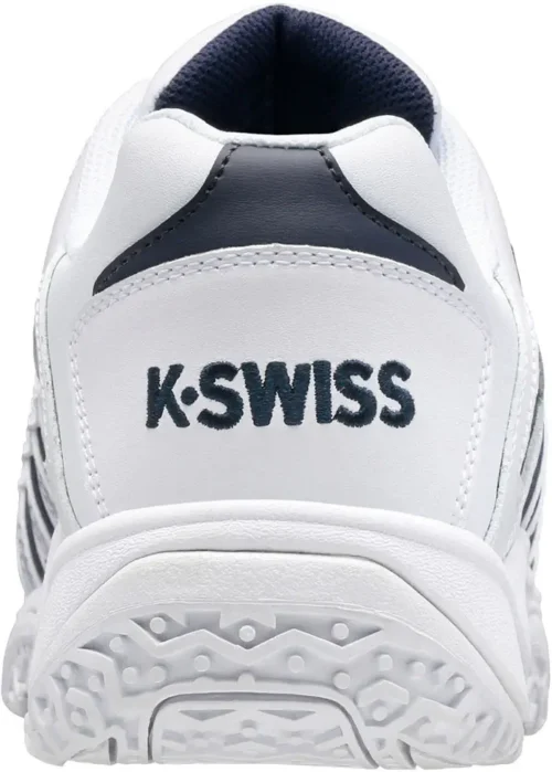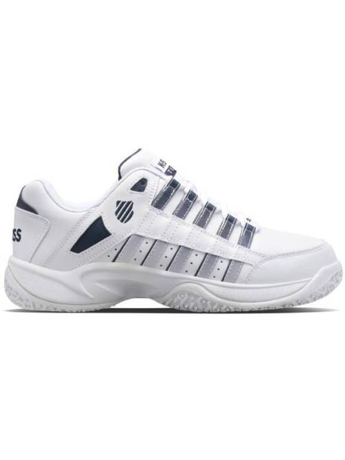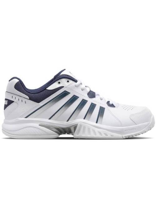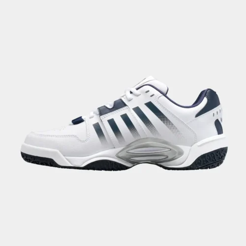 De K-Swiss Accomplish IV (Omni) is een veelzijdige en stabiele tennisschoen voor de veeleisende tennisser. De robuuste schoen heeft een klassiek design en zorgt voor comfortabele ondersteuning op de baan. De schoen heeft een brede pasvorm en beschikt over een lederen bovenzijde die zorgt voor een hoge duurzaamheid. Bovendien zorgt het waterafstotende effect van de bovenzijde ervoor dat de schoen niet zwaar wordt en de voet droog blijft. De mesh tong en ventilatiegaatjes in het bovenwerk zorgen voor de nodige ventilatie. -