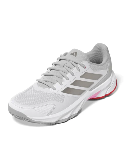 De ADIDAS CourtJam Control 3 W in wit, grijs en metallic is een veelzijdige tennisschoen voor dames die draait om controle, comfort en een stijlvolle uitstraling. Het ademende mesh bovenwerk met naadloze verstevigingen biedt ondersteuning bij snelle, laterale bewegingen, terwijl de Bounce-middenzool zorgt voor veerkrachtige demping tijdens intensieve rallies. De duurzame Adiwear-loopzool levert betrouwbare grip op diverse ondergronden, zodat je vol vertrouwen elke slag tegemoet gaat. Met zijn moderne design en metallic accenten is deze schoen net zo dynamisch als jouw spel. -